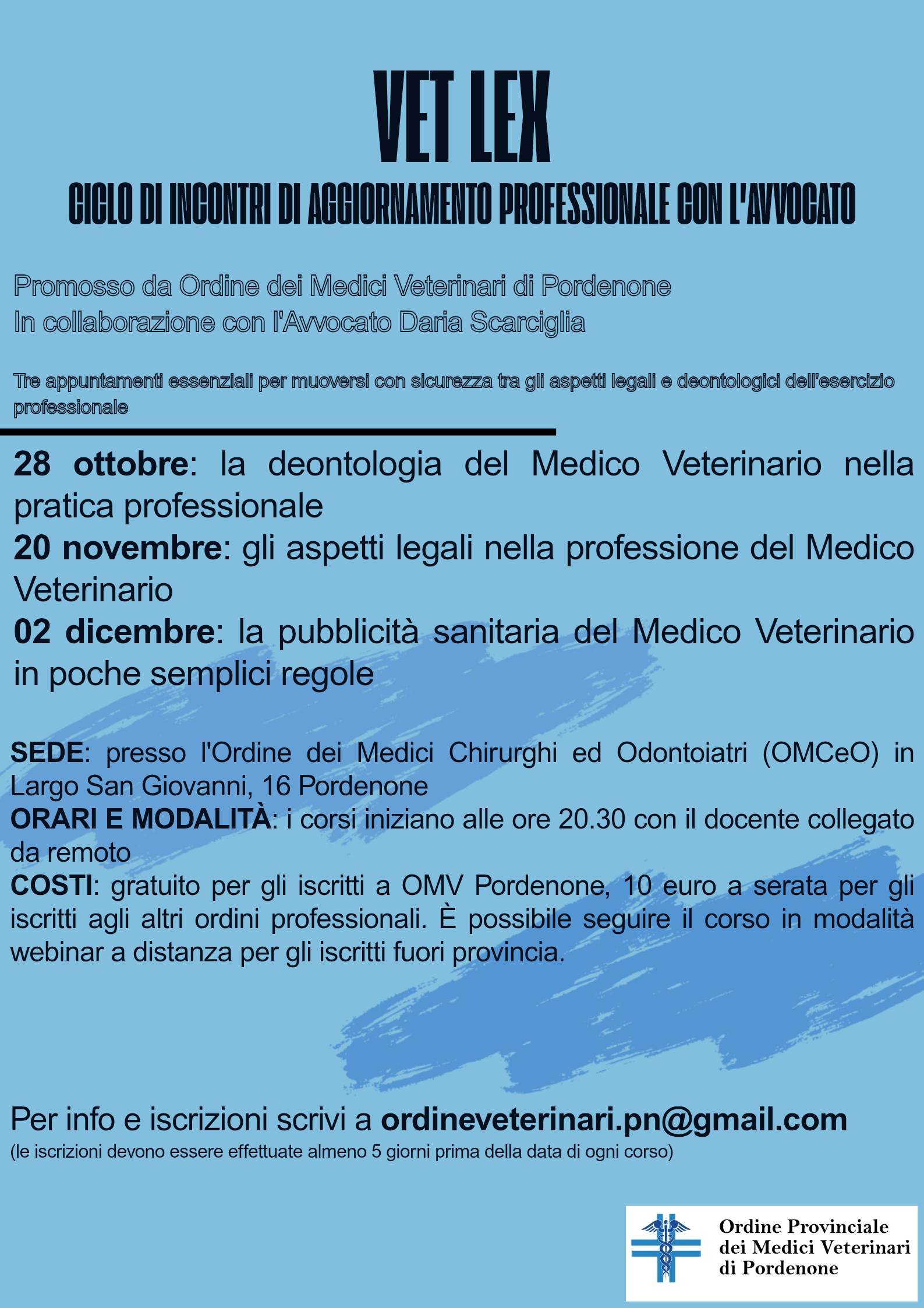 L’Ordine dei Medici Veterinari di Pordenone organizza un ciclo di incontri di aggiornamento professionale che si terranno nei giorni 28 ottobre, 20 novembre, 2 dicembre dalle ore 20:30 per una durata di circa due ore, presso la sede OMCeO di Pordenone sita in Largo San Giovanni, 16 Pordenone, con il docente collegato da remoto.